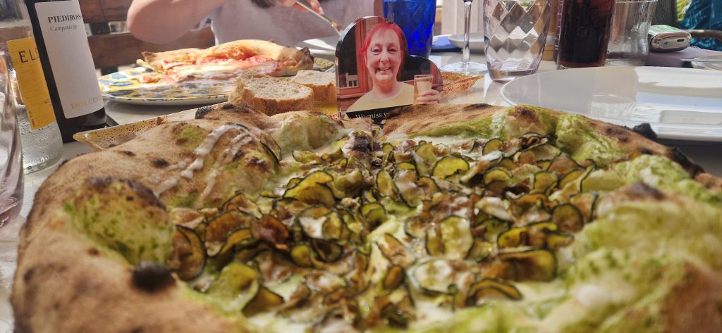 We then head back down the hill, past the stalls and stop for food at one of the many restaurants that surround a little square just down from the museum. Our first pizza of the trip.