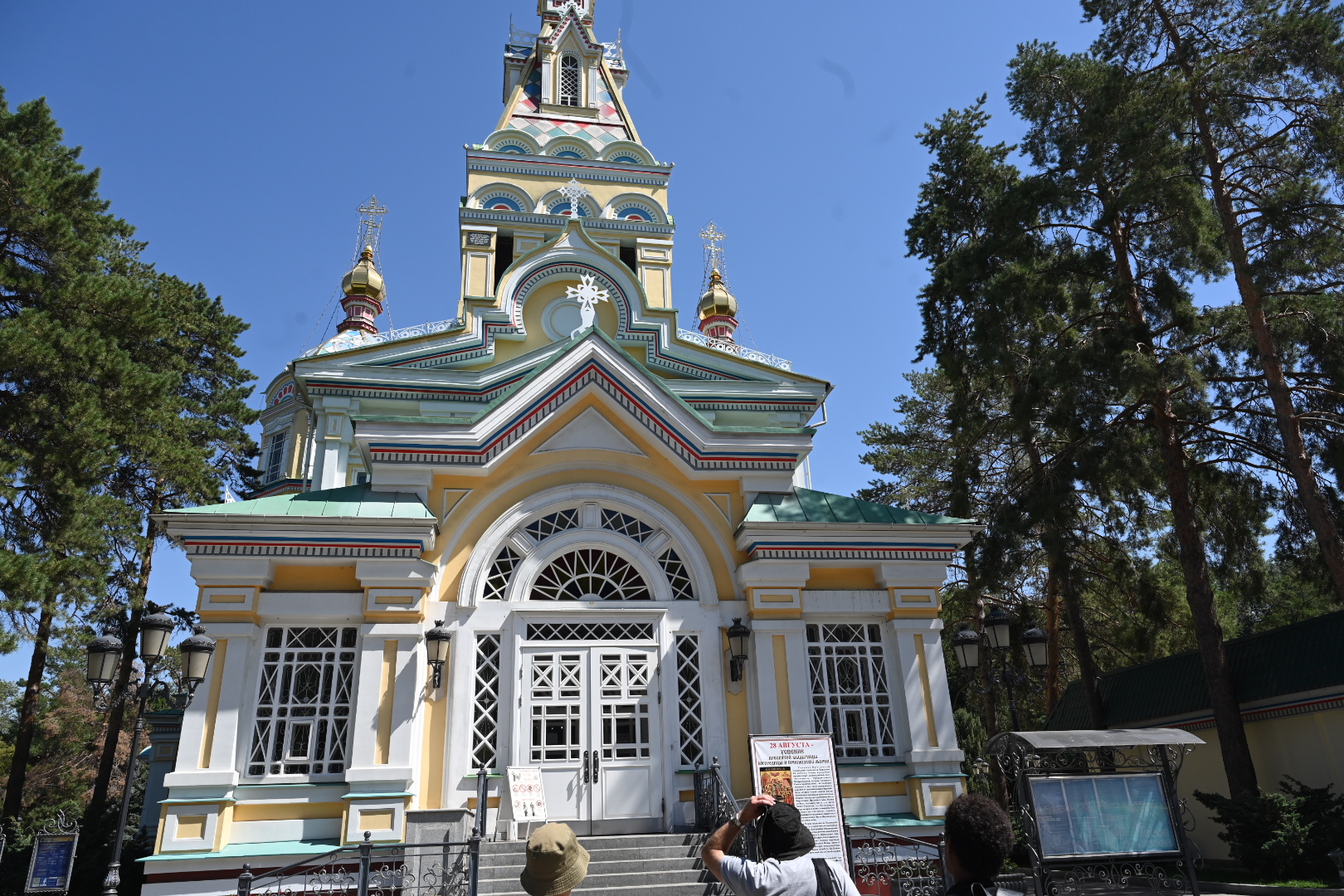 Eventually we reach Panfilov Park. The first thing we check out is Ascension Cathedral. It is a stunningly beautiful Russian Orthodox church built entirely out of wood and without the use of any nails. One theory is that they decided to not use nails because of the connection with the crucifixion. It is one of the few buildings to survive the earthquake of 2011.