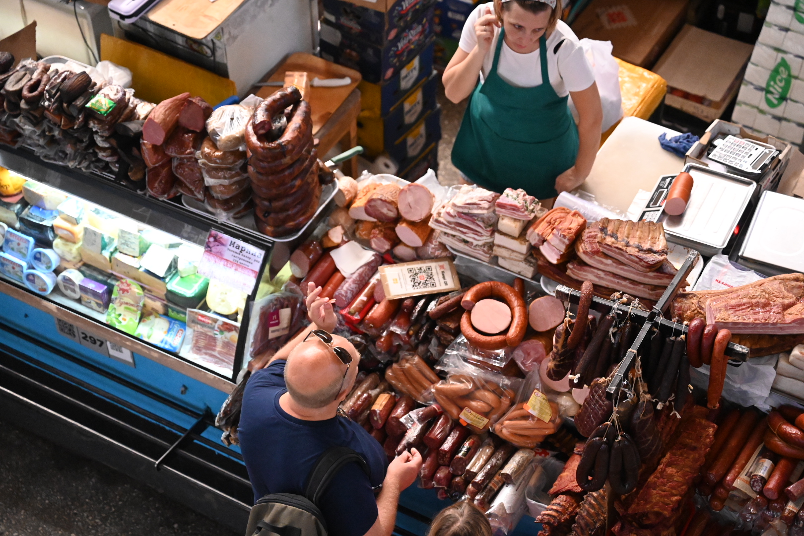 Sheriff takes us up to a cafe on a balcony overlooking the market. We try to get a table that pleasantly looks over the fruit. But it’s busy so we have a table overlooking the butchers. I think it’s probably the Kazakhstan equivalent of a greasy spoon. Traditional, basic and – well – a bit grim to be honest. Especially for vegetarians. The best bit was the watermelon which we carved up on the table. We eat some but Sheriff devours most of it.