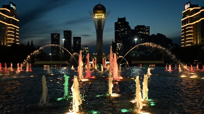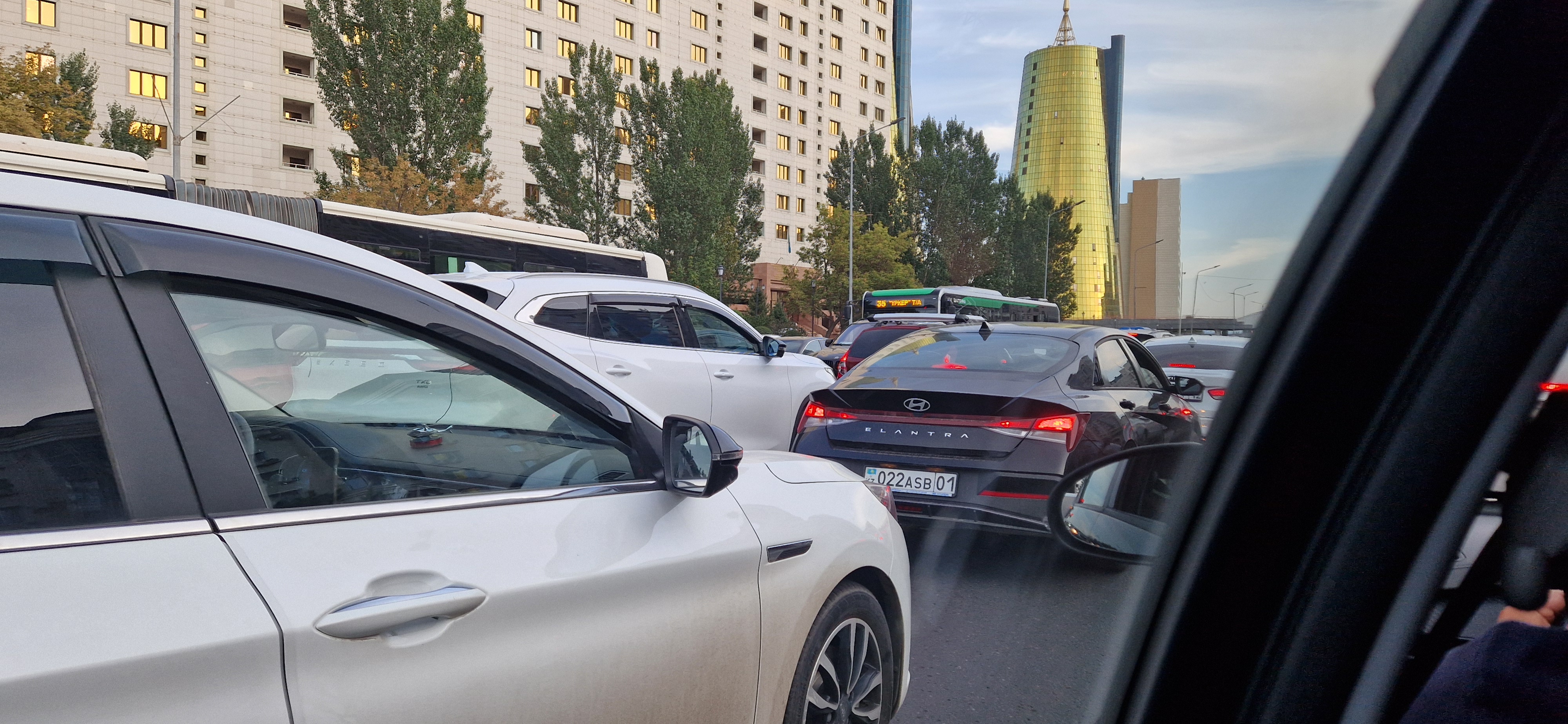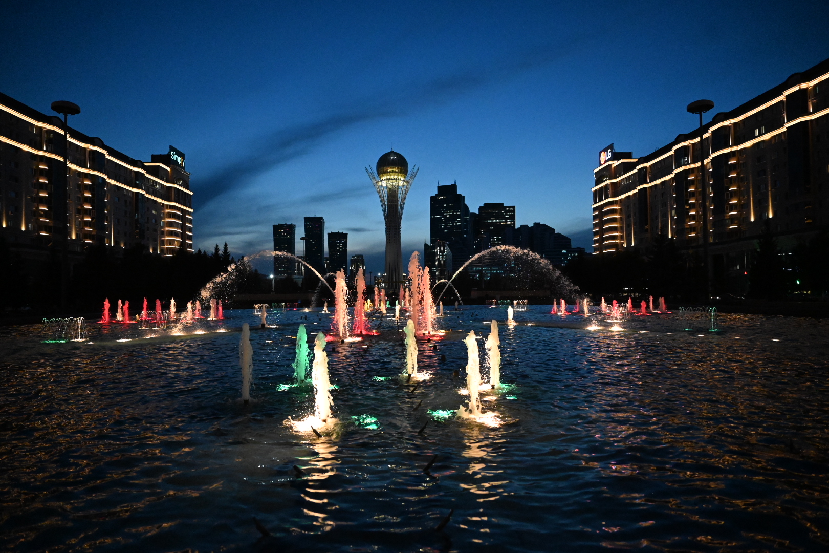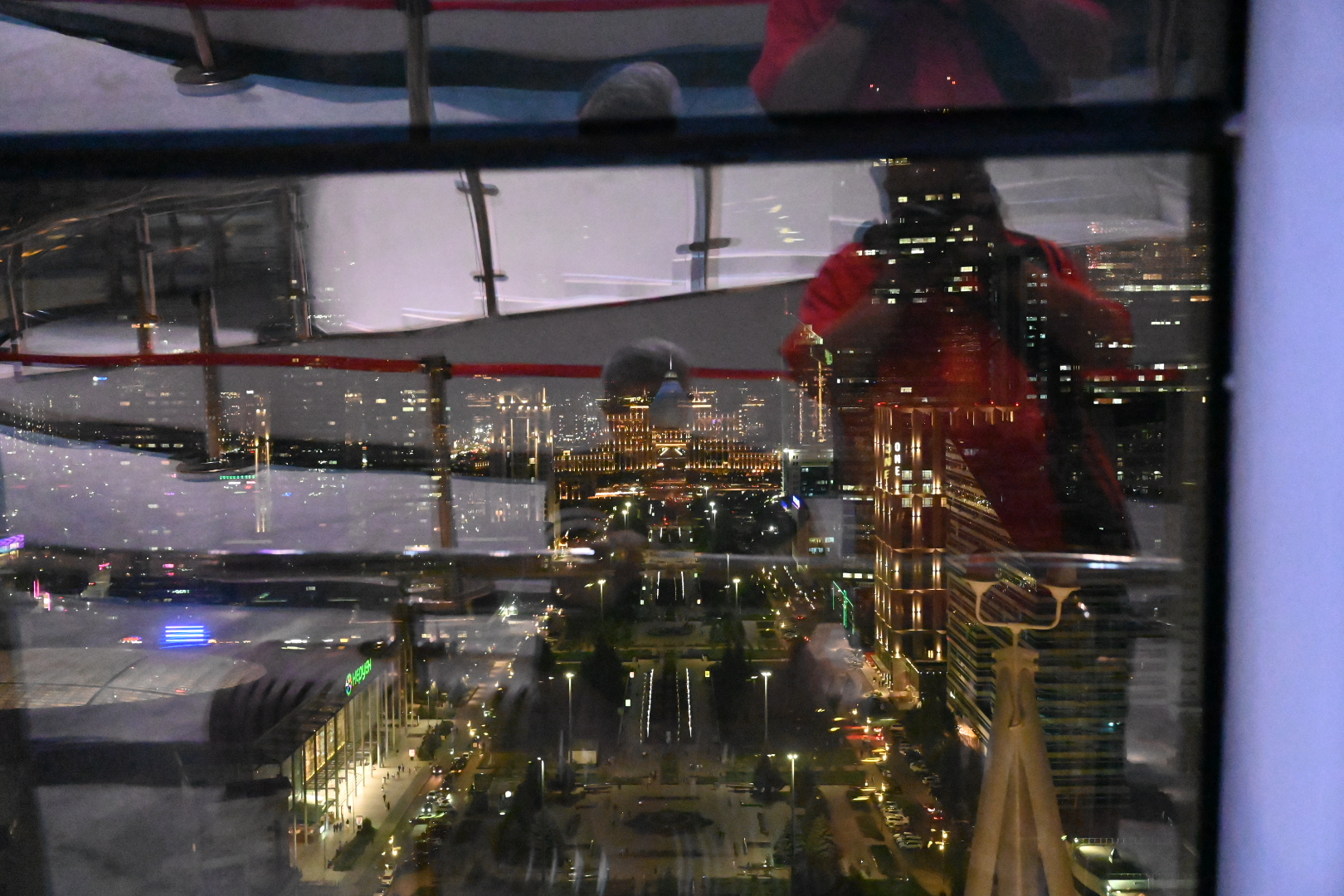 We make the short walk to the Baiterek Tower. A 105m tall tower that resembles the World Cup trophy. It is apparently representative of Kazakhstan independence and was commissioned by that First President dude. It’s composed of a series of steel struts that rise up to support a bit spherical viewing platform. We hop in the lift and ride to the top.