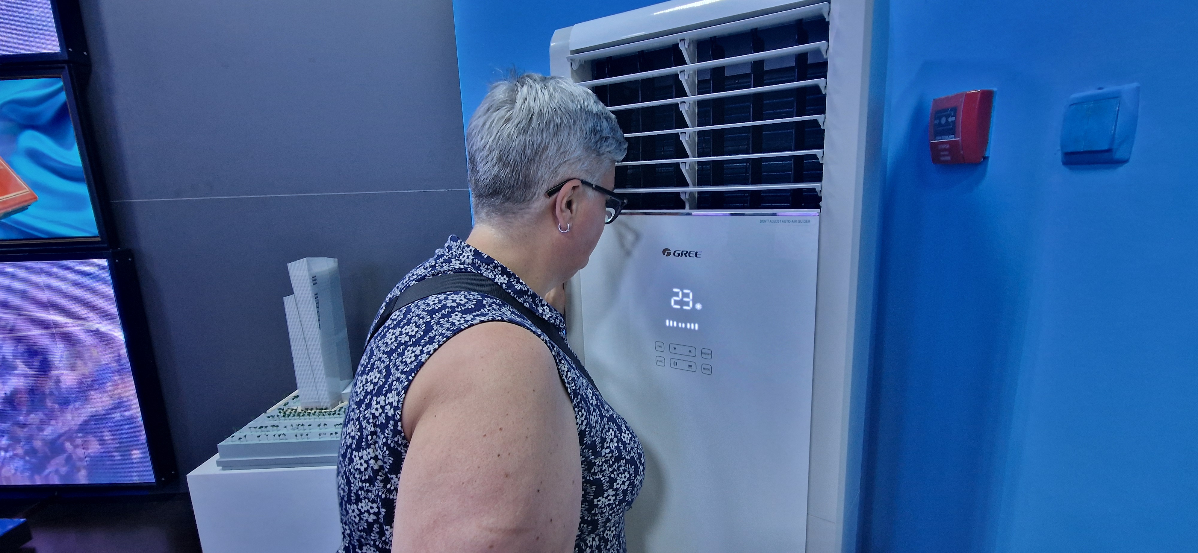 Megan’s favourite bit was standing in front of the air conditioning unit.
